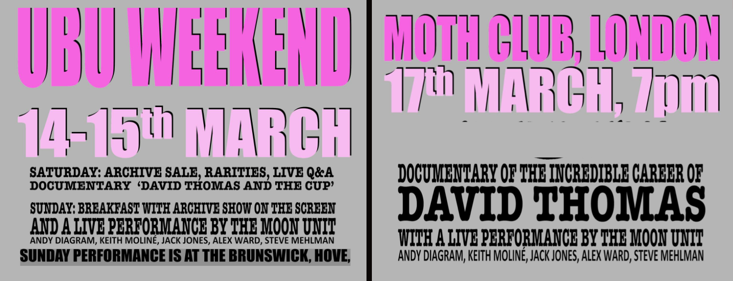 Coming up on weekend of 14th and 15th March in Brighton and 17th March in London, a very special celebration of David Thomas and all things Ubu.
